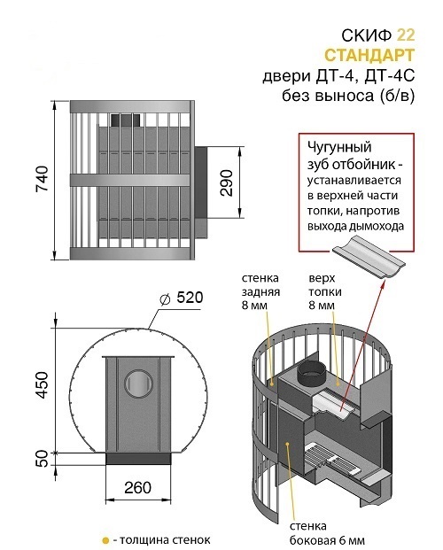Банная печь Скиф ВЧ укомплектована топочной глухой чугунной дверцей и имеет конвекционно-вентилируемый кожух (сетка), который изготовлен из калиброванного прута диаметром 6 мм. Дровяная печь Везувий Скиф 22 ВЧ рассчитана на объем парильного помещения 12-22 м3. В конструкции данной печи предусмотрен топочный тоннель длиной 250 мм, при помощи которого печь топится из соседнего помещения, смежного с парильным.