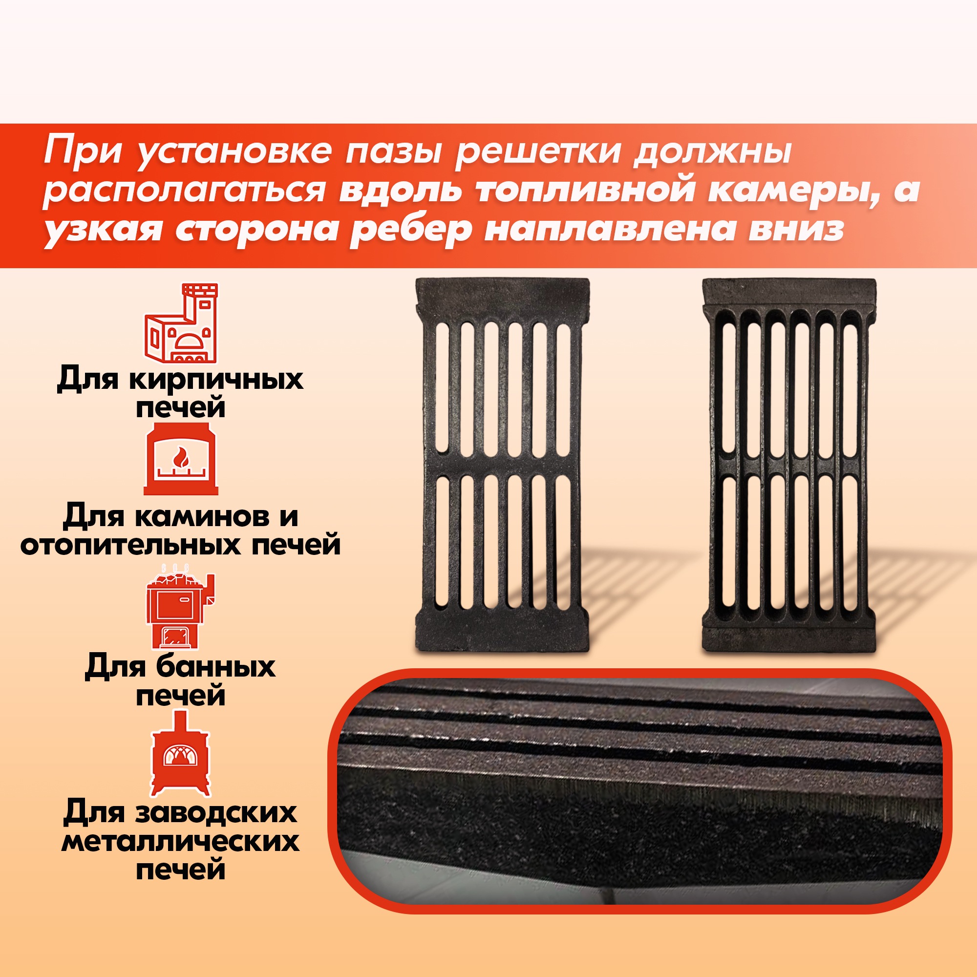 Обращаем внимание, что колосниковая решетка из чугуна РУ-7 — это 1/2 колосниковой решетки для угля РУ-2 и предназначена для укладки с решеткой РУ-2 в увеличенные по ширине топки печей размером 300х300 мм и больше.