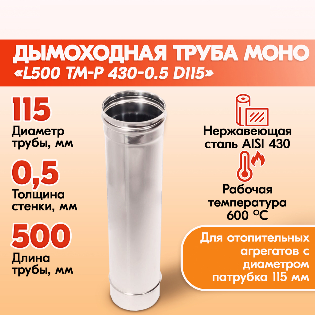 Трубы для дымохода из нержавейки Труба L500 ТМ-Р 430-0.5 D115 правильный дымоход Теплов и Сухов из нержавеющей стали для котла и печи